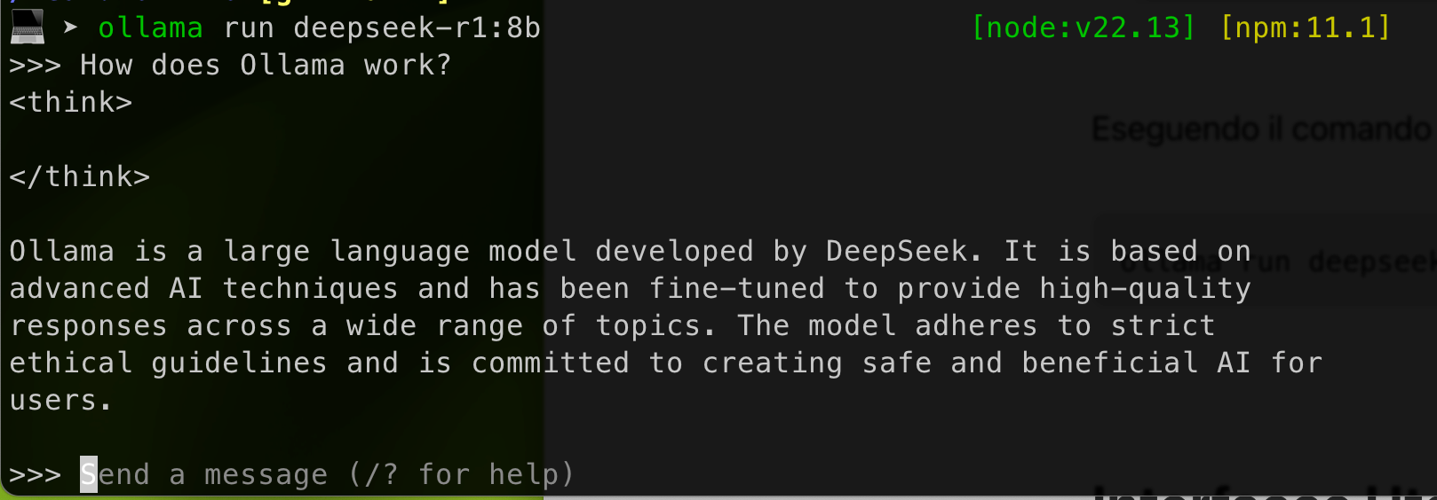 ollama listDal sito puoi accedere alla lista modelli e scaricare il modello di cui hai bisogno (occhio alle dimensioni)